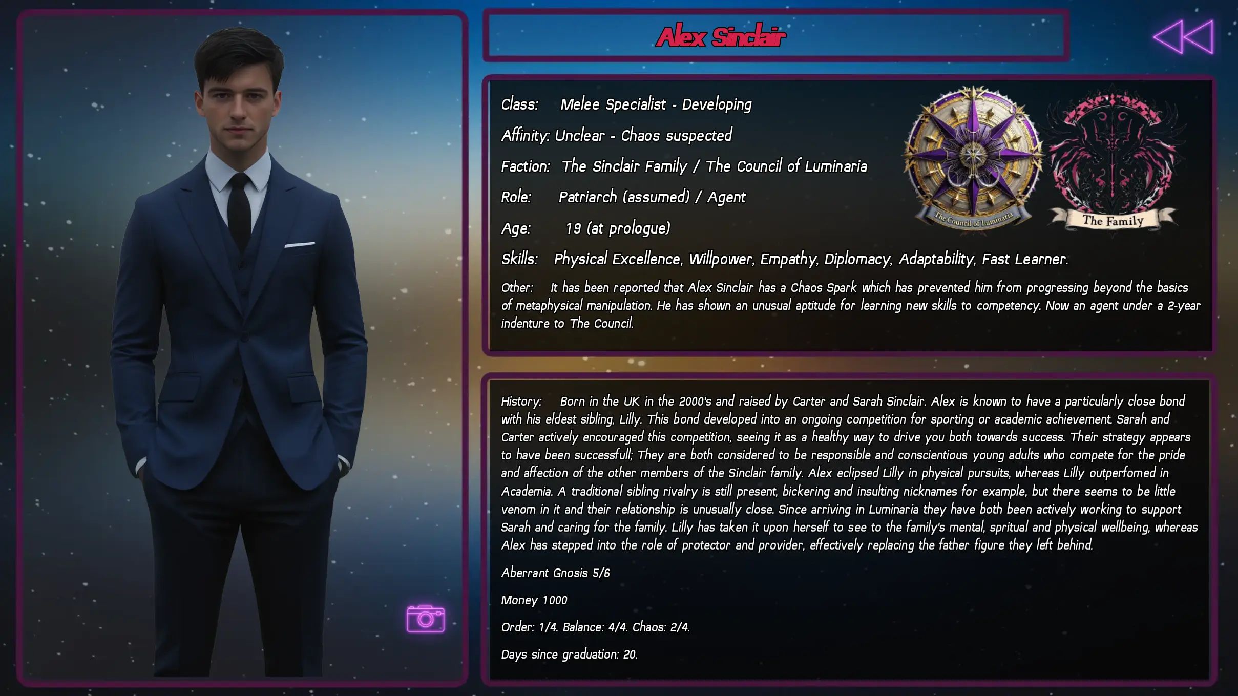 The last week since the EA release has been quite productive and I've pretty much done all the under the hood tinkering I needed to do with the game UI and some of the variable management stuff. All the character sheets are now migrated to the new format and the character bio's rewritten (not substantially but they have been changed to try to make them read like someone else's report or description of the character). The new format allows me to do some dynamic stuff with these character screens and update them as you reach various milestones and uncover more information and experiences. So you won't now know all the details about everyone, that will be revealed as the MC - or the information he has access to via the government, is updated. I have also redesigned some of the features of characters, so some of the old bios are out of date in terms of affinities. The displayed image will also change as you progress.